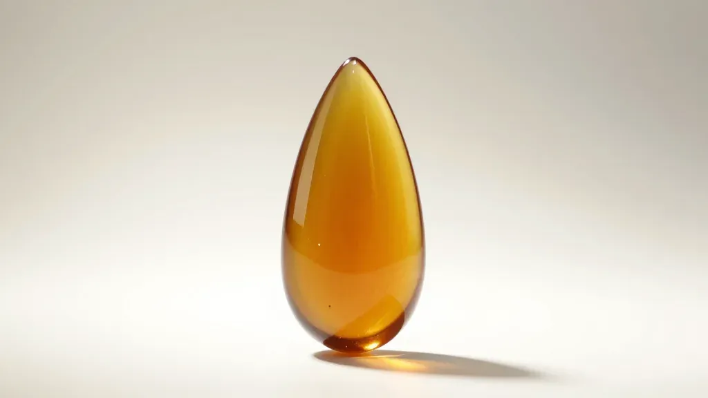 A teardrop-shaped amber glass object with a glossy, reflective surface, softly lit from above, creating a gradient effect and highlights. The pure white background provides a clean and unobtrusive backdrop, emphasizing the object's form and color.