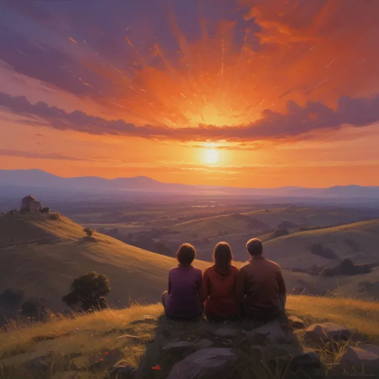 Three friends sit on a hilltop, gazing at a vibrant sunset with soft, diffused light creating a warm glow. The rolling hills and distant mountains frame the serene landscape, offering a clean and expansive backdrop.