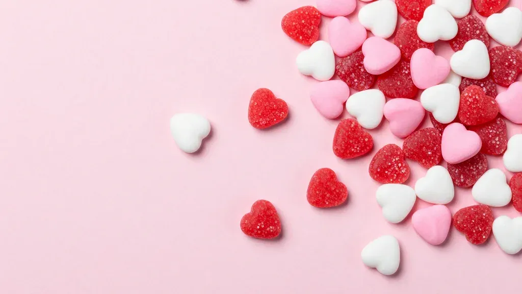 Heart-shaped candies in red, pink, and white are scattered diagonally across a soft pink surface, their sugary crystalline texture catching soft overhead light. The shallow depth of field emphasizes mid-ground candies while the clean, matte background provides ample negative space for design integration.