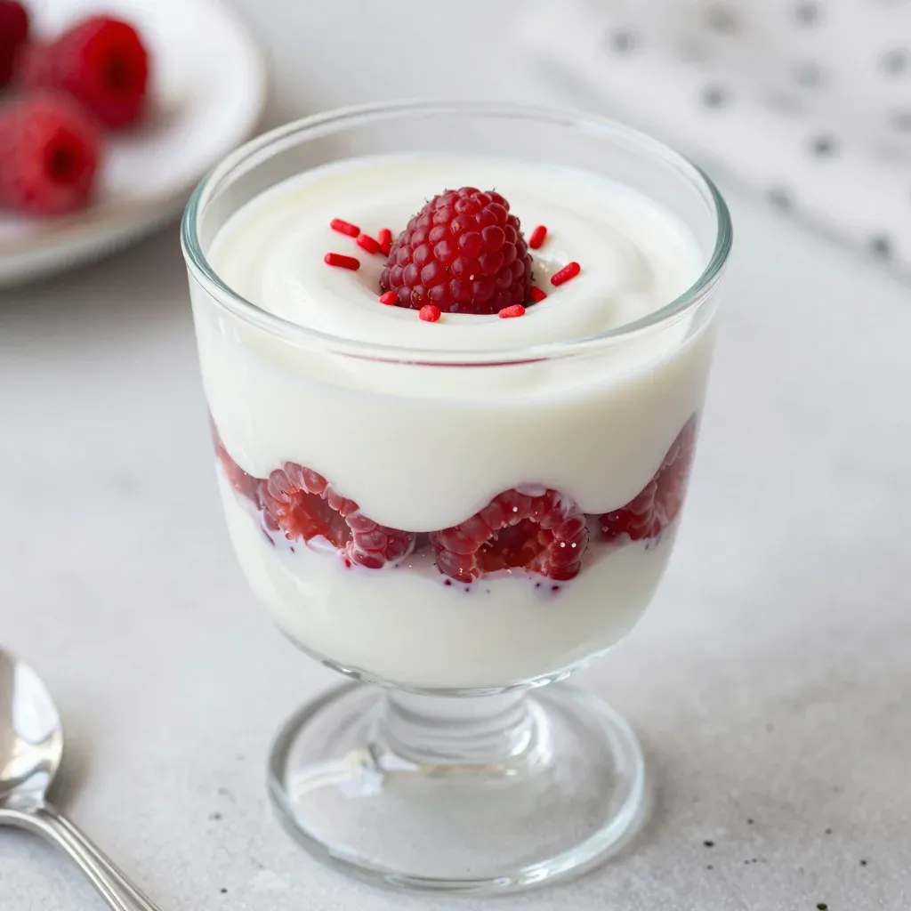 A creamy yogurt parfait layered with glossy raspberries, presented in a glass with a shallow depth of field, highlighting the textures and soft lighting. The blurred background with fresh raspberries and a spoon adds context and depth, making it ideal for culinary and food photography.