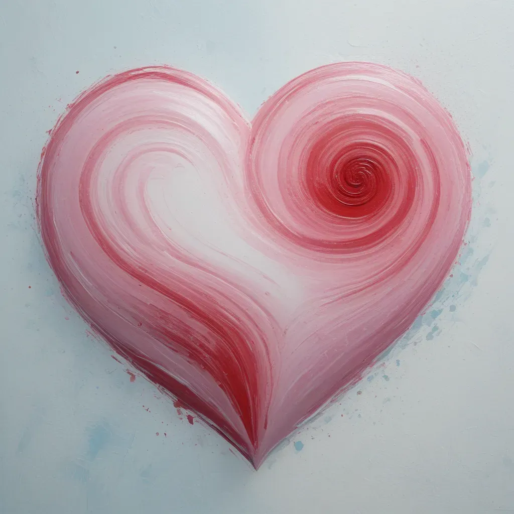 A heart-shaped canvas with soft, velvety paint and circular brush strokes, illuminated by diffused, soft light that enhances the gradient of pink hues. The light gray, textured background provides a neutral backdrop, making the heart stand out.