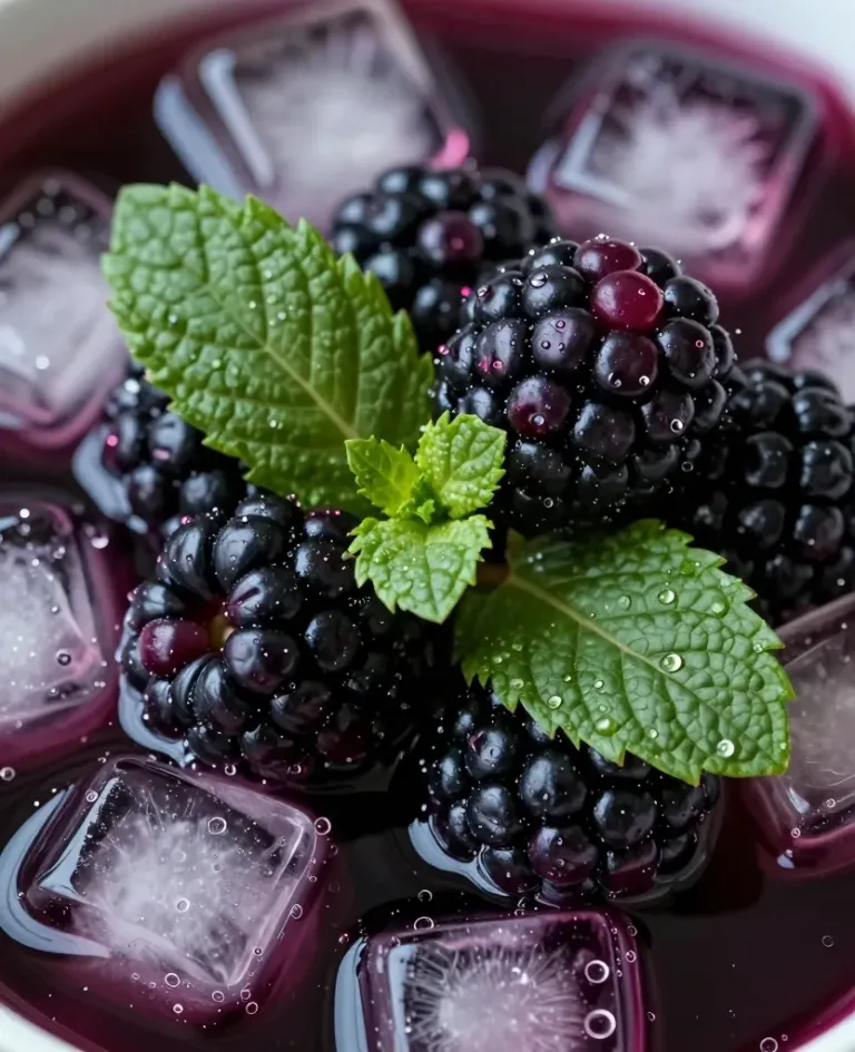 Fresh blackberries and mint leaves float in a glossy, syrupy purple liquid surrounded by crystalline ice cubes, with soft highlights accentuating their textures. The top-down close-up composition with shallow depth of field isolates the subject against a blurred dark purple backdrop, emphasizing layering and contrast.