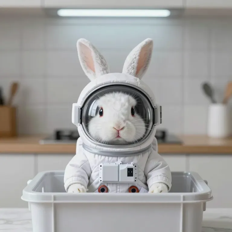 A white rabbit in a detailed astronaut suit sits in a white plastic crate, with soft, diffused lighting highlighting the glossy fabric and clear visor. The slightly blurred kitchen background with light-colored tiles and wooden accents provides a domestic context, emphasizing the subject with copy space.