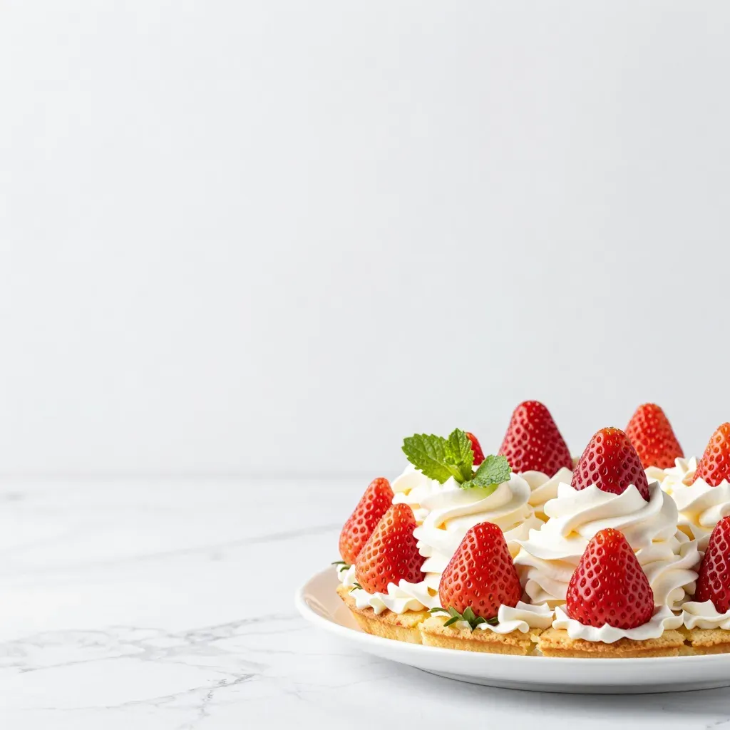A beautifully presented strawberry tart with glossy strawberries, creamy whipped cream, and fresh mint leaves, set against a soft, diffused light that highlights the textures and creates gentle shadows. The shallow depth of field and white marble background emphasize the tart, making it perfect for culinary and food photography.
