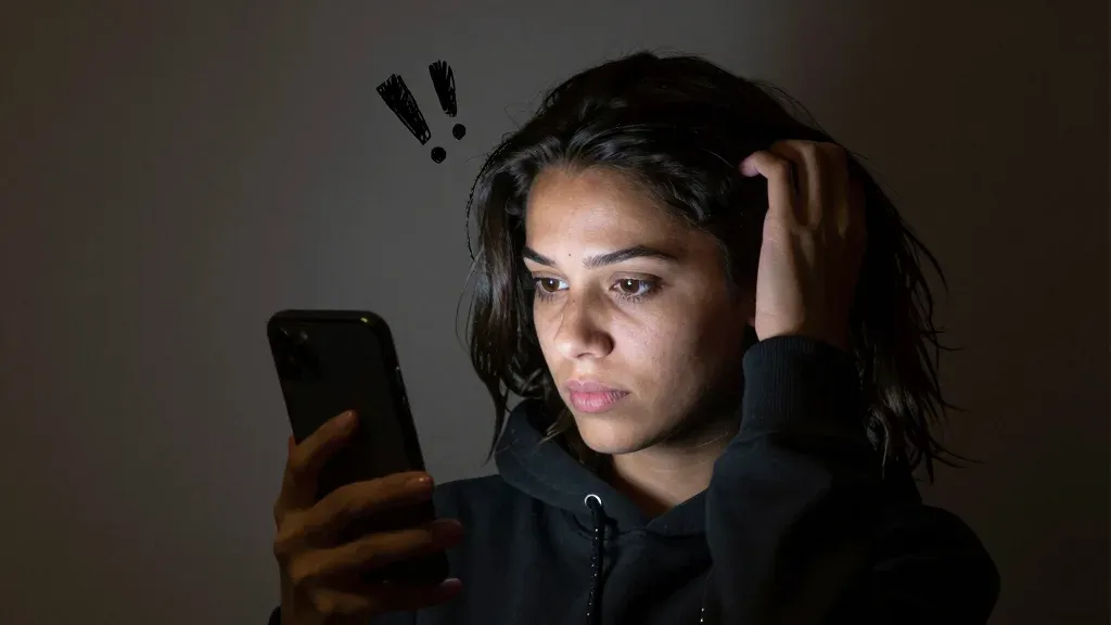 A person closely examines their hair in a mirror, with soft directional light highlighting their face and creating a warm glow. The composition is a close-up, focusing on the subject's face and upper body, with the phone screen reflection adding depth and a neutral background keeping the focus on the subject.