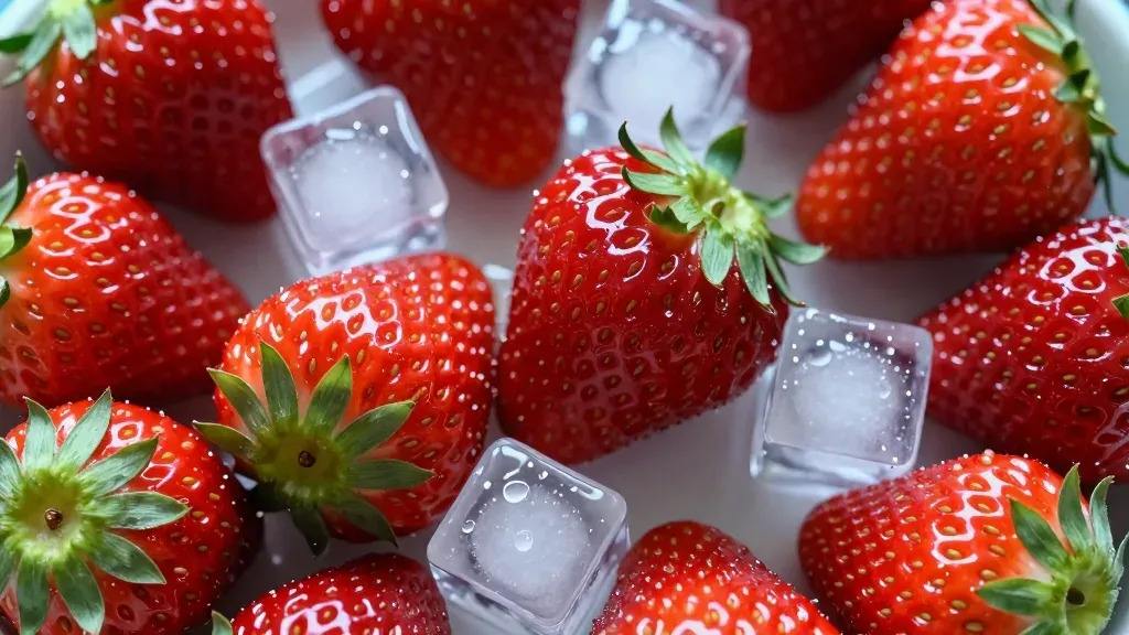 Bright red strawberries with a smooth, slightly rough texture are arranged in a scattered pattern with sharp-edged ice cubes, creating a visually balanced and appetizing composition under soft, diffused lighting. The plain white background keeps the focus on the subject, providing ample copy space.
