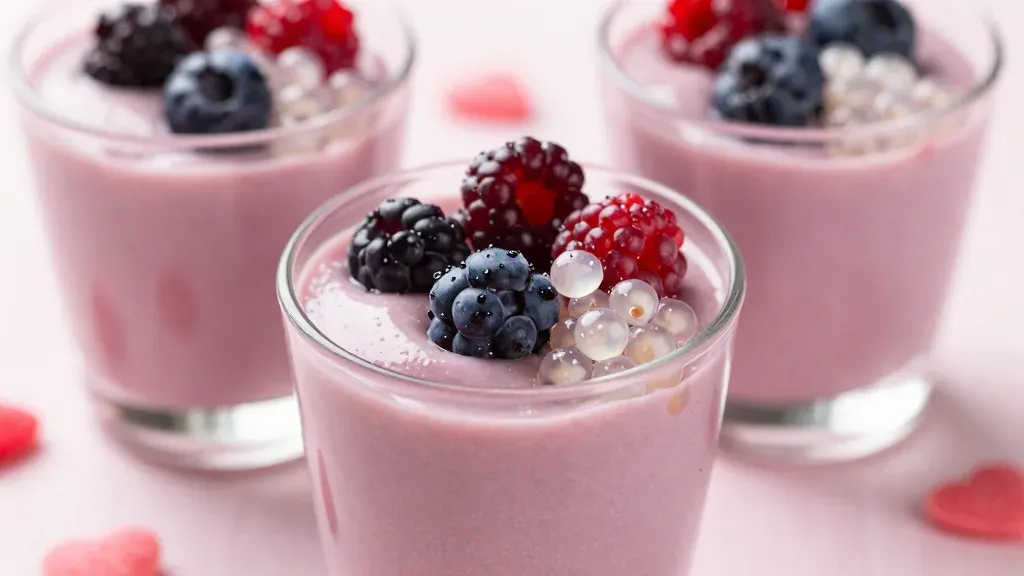 Three glass cups filled with smooth pink berry mousse are topped with plump, glossy raspberries, blackberries, and blueberries, creating a vibrant and appetizing presentation. Soft, diffused front lighting enhances the creamy texture of the mousse and the waxy sheen of the berries, while a shallow depth of field isolates the foreground cup against a clean, pale pink background with scattered heart-shaped confetti.
