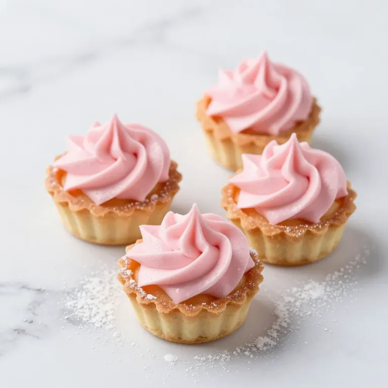 Four mini tarts with glossy pink frosting and flaky golden-brown crusts are arranged in a loose square on a white marble surface, softly lit from above to create gentle shadows, emphasizing the delicate textures and vibrant colors.