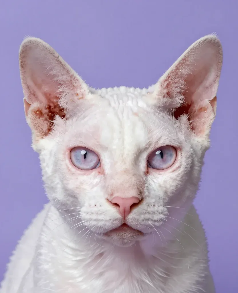 #Albino#Cat#Blue Eyes#Glossy White Fur#Muted Purple Background#Soft Lighting#Direct Gaze#Close-Up#Texture
