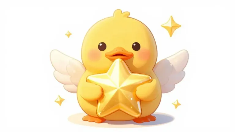 A duckling with wings spread holds a shiny star, bathed in a warm, golden glow. The soft white background provides ample copy space, making it ideal for branding or product placement.