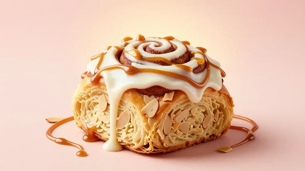A flaky almond twist pastry topped with creamy white icing and glossy caramel drizzle, garnished with toasted almond slivers. Soft diffused lighting highlights the viscous icing and syrupy caramel, with a shallow depth of field and clean pink backdrop providing visual focus.