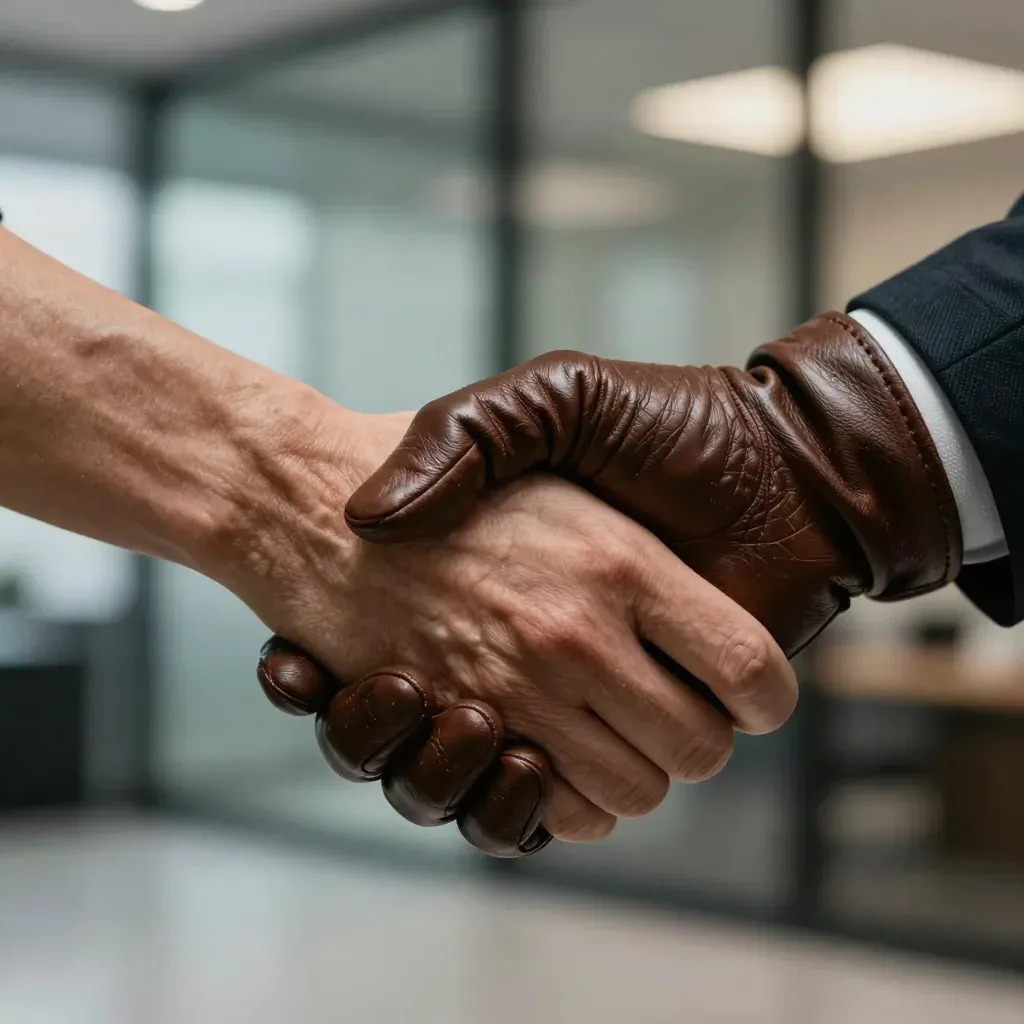 A close-up of a gloved hand shaking hands with an ungloved hand, set against the warm, natural light of an office window, highlighting the textures and creating a professional yet intimate atmosphere.