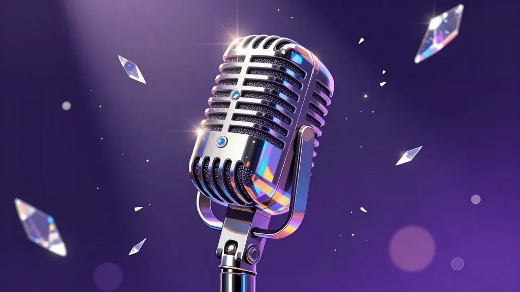 A vintage microphone is surrounded by a burst of iridescent diamonds, creating a dynamic and magical atmosphere. The deep purple background and soft light spots enhance the ethereal quality of the image.