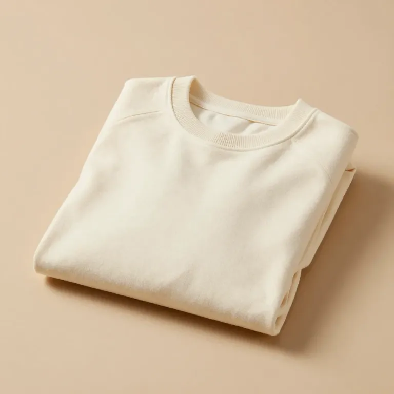 A neatly folded cream-colored crewneck sweater with a soft, slightly textured fabric and a subtle sheen, softly lit to highlight the folds and give the sweater a gentle glow. The neutral, soft-toned background blurs to emphasize the sweater, creating a clean and minimalistic composition.