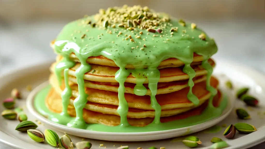A stack of golden pancakes is topped with a glossy emerald green sauce and finely chopped pistachios, creating a visually appealing and texturally rich dessert. The soft and diffused lighting enhances the warm and inviting atmosphere, while the blurred background ensures the focus remains on the delectable stack.