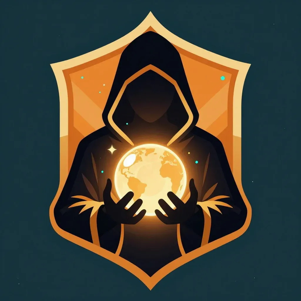 A silhouetted hooded figure cradles a luminous globe, its soft velvet cloak and glassy orb illuminated by warm backlighting. The symmetrical composition within a polished shield crest against a solid teal background creates strong visual focus and clean framing.