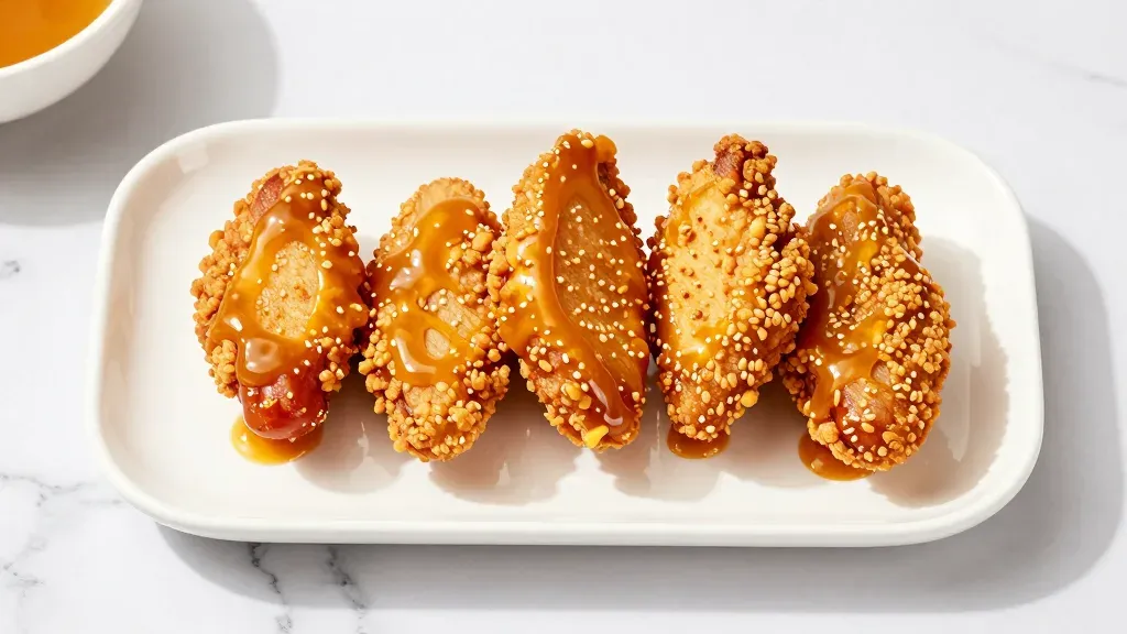 Five hand-battered chicken wings with a crispy sesame coating and glossy amber glaze are arranged in a row on a white rectangular platter. Soft overhead lighting creates subtle highlights on the glaze and gentle shadows, while a shallow depth of field emphasizes the middle wings against a clean marble background with minimal distractions.