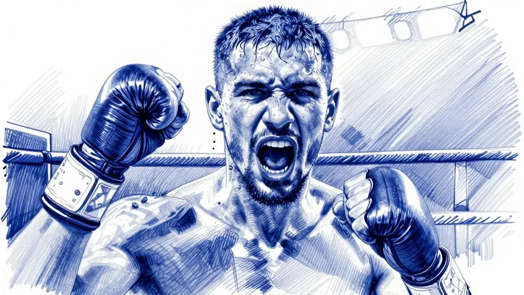 A boxer in the ring, mid-shout, wearing boxing gloves, with sweat and rough textures, dramatic lighting highlighting the face and gloves, and a shallow depth of field with minimal background detail.