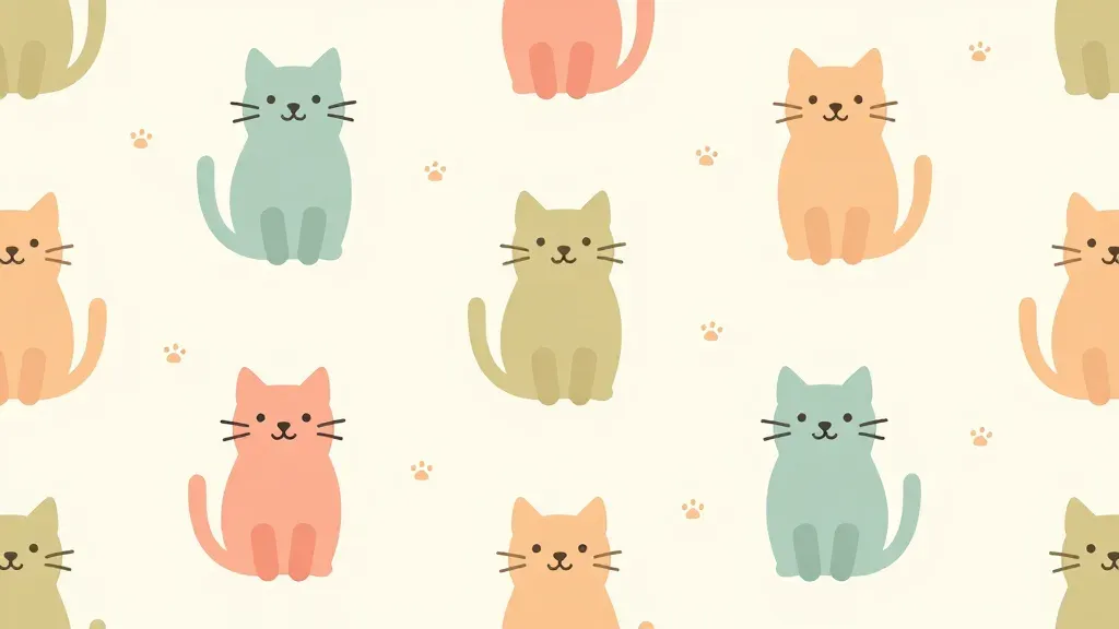 Repeating pattern of seated kittens in mint green, peach, olive, and salmon hues, accented with pale gold sparkles. Diffuse, even lighting and grid-like composition with centered framing create a clean, decorative surface suitable for design applications.