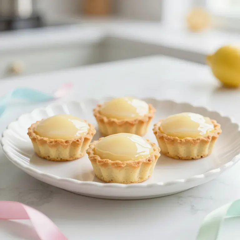 Four lemon curd tarts with crispy, flaky crusts and creamy, glossy lemon curd are arranged on a scalloped white plate, bathed in soft, diffused, warm light that creates gentle highlights and shadows, with a blurred kitchen counter and a lemon in the background, suggesting a homey setting.
