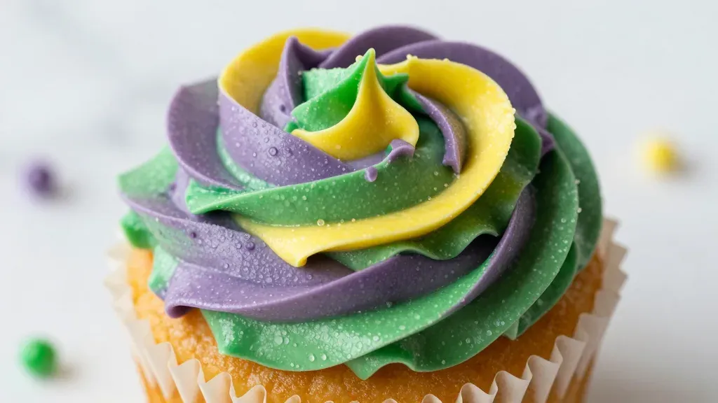 A close-up of a cupcake adorned with vibrant, glossy frosting in purple, green, and yellow hues, featuring sugar crystals and a ridged texture. The soft, diffused lighting highlights the frosting's sheen, creating a clean and simple backdrop with scattered sugar crystals and small candies.