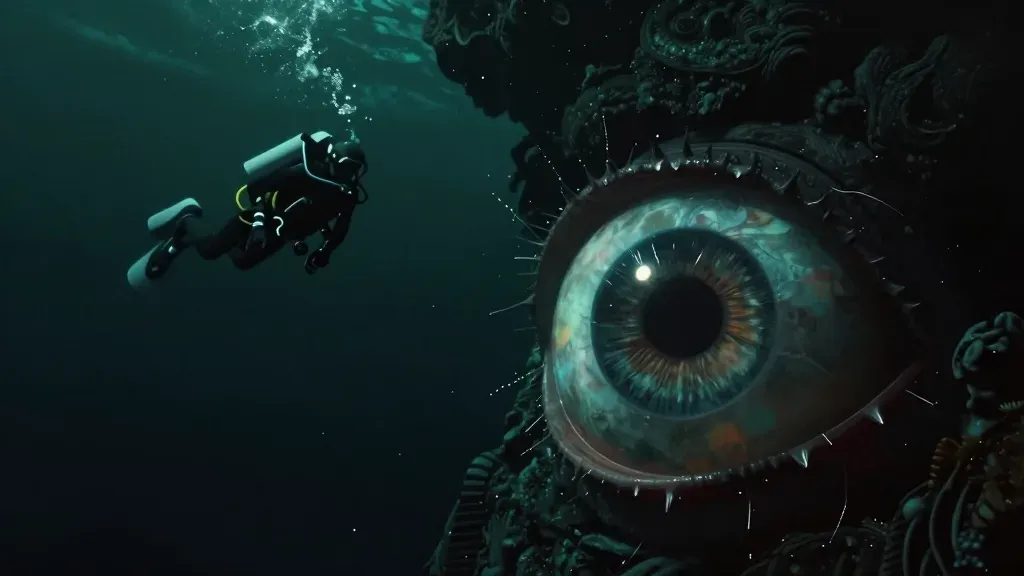 A scuba diver navigates through a bioluminescent alien trench, illuminated by vibrant yellows and oranges, creating a surreal and otherworldly atmosphere. The diffused lighting and depth of field emphasize the diver and the glowing plants, while the blurred background enhances the sense of exploration and mystery.