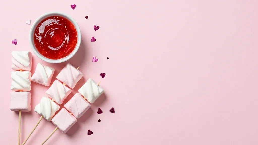 Soft marshmallows on skewers are arranged diagonally, leading the eye towards a glossy red dipping sauce. The soft, diffused lighting highlights the glossy surfaces and creates gentle shadows, enhancing the visual appeal against a clean pink background.