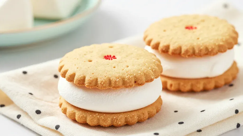 Golden-brown marshmallow sandwiches with soft, creamy marshmallows nestled between crisp cookies, bathed in warm, soft light that highlights their glossy texture. The shallow depth of field and soft, blurred background with a polka-dot napkin add a playful and homely feel, making the image ideal for culinary and food photography.