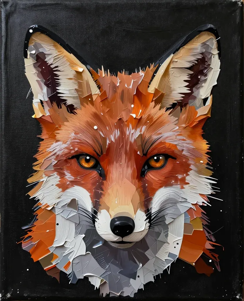 A fox's face is depicted with thick, layered paint strokes, creating a textured and expressive appearance. The direct lighting highlights the depth and detail of the paint, making the subject stand out against the black background.
