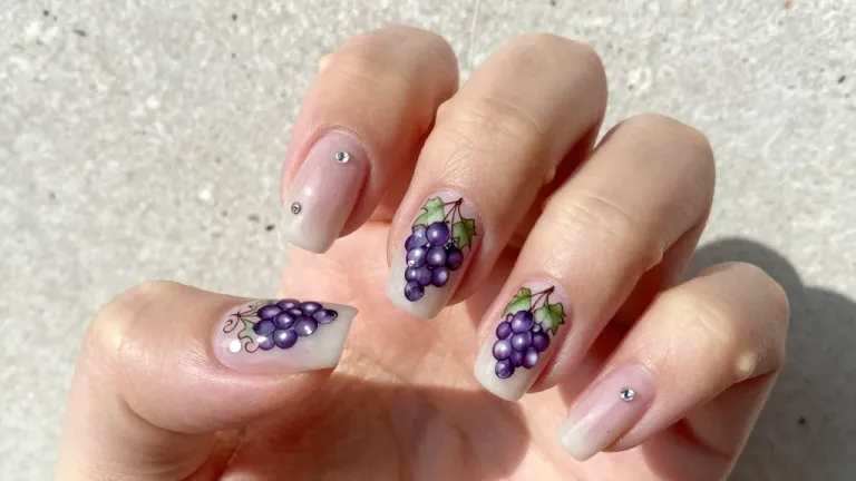 A close-up of a hand showcasing intricately designed nails with grape vine accents, set against a textured concrete background. The natural lighting highlights the detailed nail art, creating a soft, elegant atmosphere.