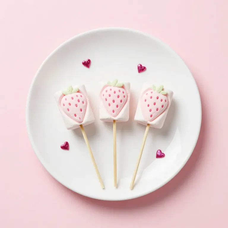 Smooth, glossy strawberry marshmallow skewers with a soft, diffused light highlighting their texture and vibrant pink color. The minimalist, solid pink background and shallow depth of field create a clean, focused composition ideal for culinary or food photography.