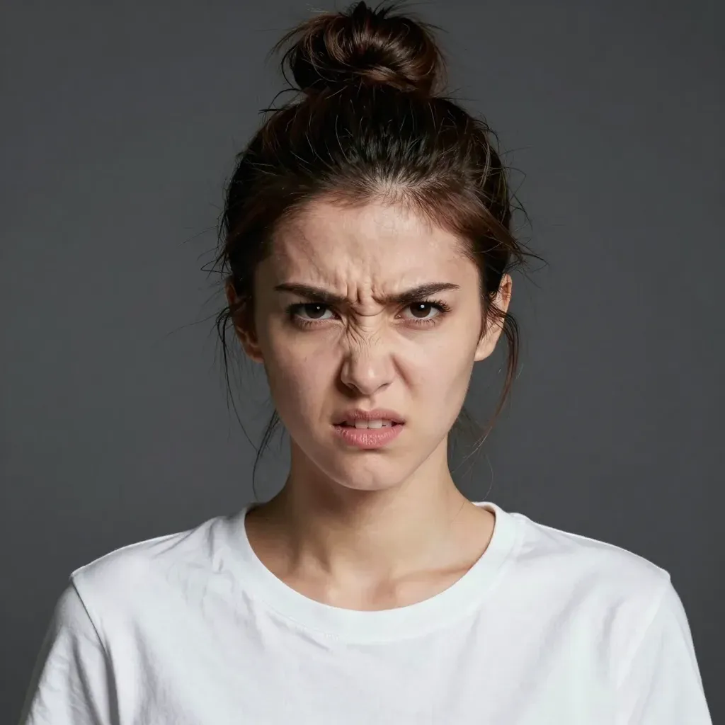 A woman with a tense expression and furrowed brow, wearing a plain white T-shirt, stands against a dark, neutral background. Soft directional lighting highlights her facial features, creating a dramatic and focused composition.