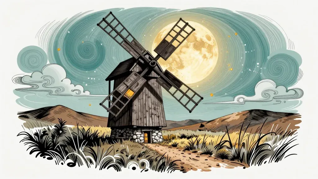 A weathered, crooked windmill stands under the ethereal glow of a full moon, casting a soft, inviting light over a serene landscape. The swirling clouds and muted earth tones create a dreamy, almost magical quality, perfect for a tranquil, atmospheric backdrop.