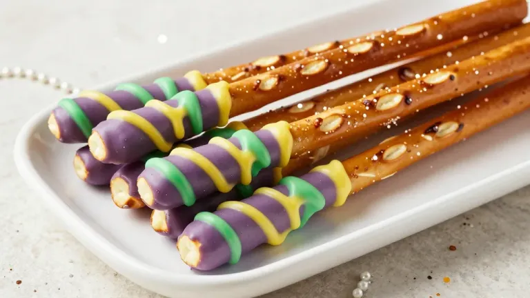Glossy purple and yellow icing adorns pretzel rods, neatly stacked on a white plate, highlighting the texture and color contrast. The soft, diffused lighting accentuates the glossy icing and rough pretzel texture, creating a visually appealing composition.
