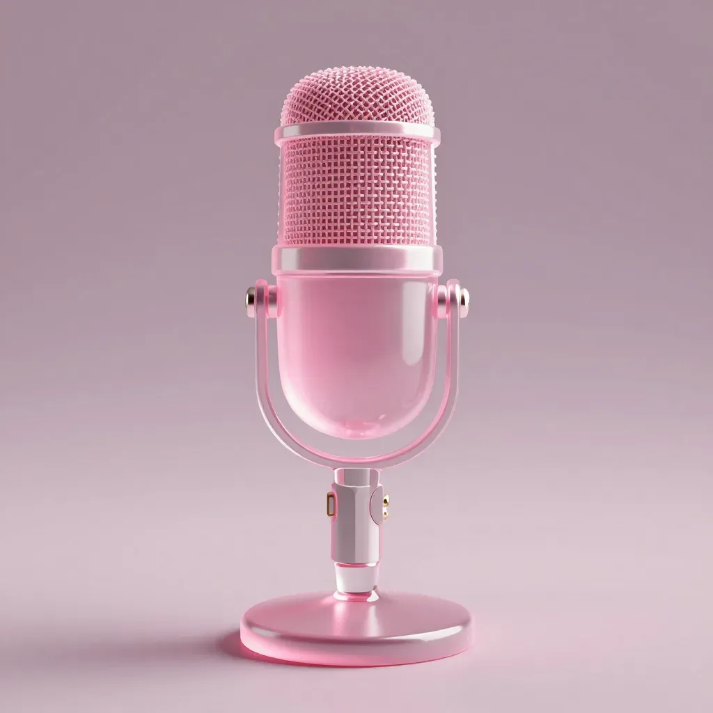 A vintage-style crystal microphone with a glossy pink finish and white accents, softly lit from above, creating highlights and reflections. The minimalistic composition and blurred background emphasize the microphone as the focal point.