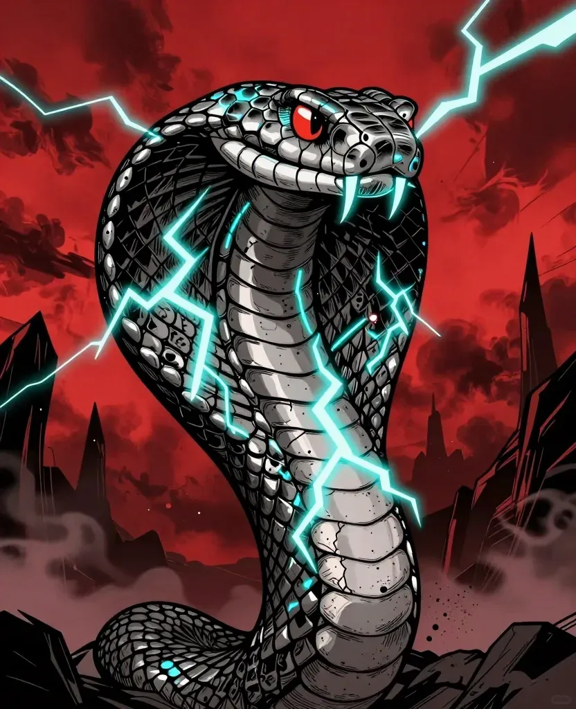A glossy, metallic electric cobra with red eyes is coiled and ready to strike, illuminated by sharp blue lightning bolts against a stormy red sky. The dynamic composition and dramatic lighting make this image ideal for high-contrast, action-oriented designs.