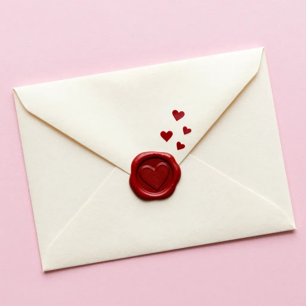 A white envelope adorned with a glossy red wax seal and small red hearts, softly illuminated by diffused light that highlights the texture and creates subtle shadows. The soft pink background provides a gentle contrast, enhancing the romantic and elegant composition.