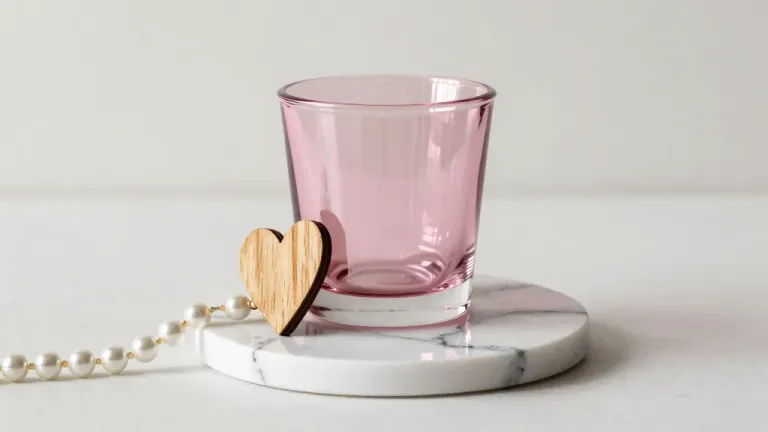A close-up of a pink glass resting on a white marble tray, illuminated by soft, diffused light that highlights the smooth textures and cool tones of the marble and glass. The clean white background and shallow depth of field emphasize the elegance and simplicity of the composition.