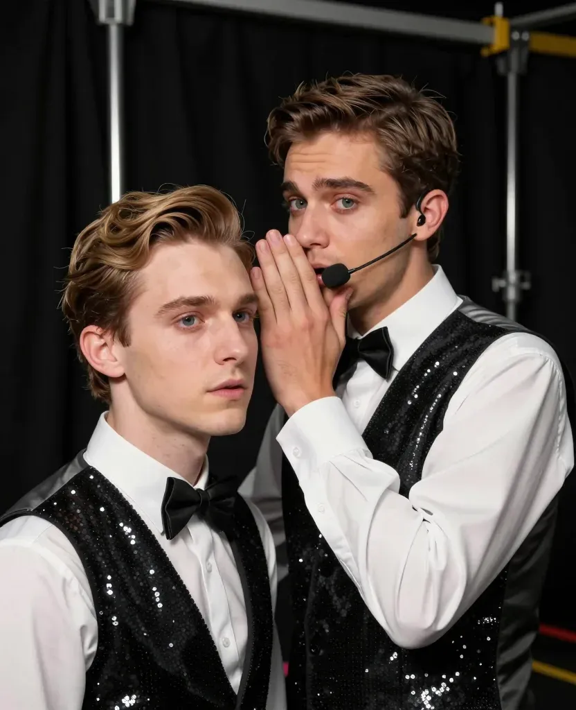 Two individuals in formal attire share a close, intimate whisper, with glossy sequined vests and soft, diffused lighting creating gentle shadows. The blurred dark curtains in the background suggest a backstage setting, adding a sense of privacy and focus to the interaction.