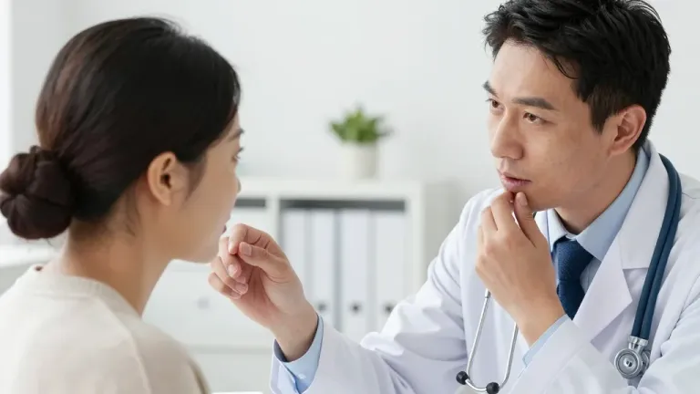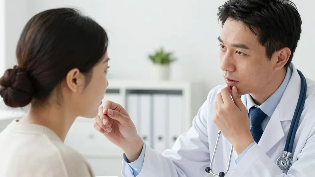 A doctor leans in to whisper to a patient, creating a close and intimate interaction. The soft, diffused lighting and shallow depth of field emphasize the emotional connection, while the clean clinic background provides a professional setting.