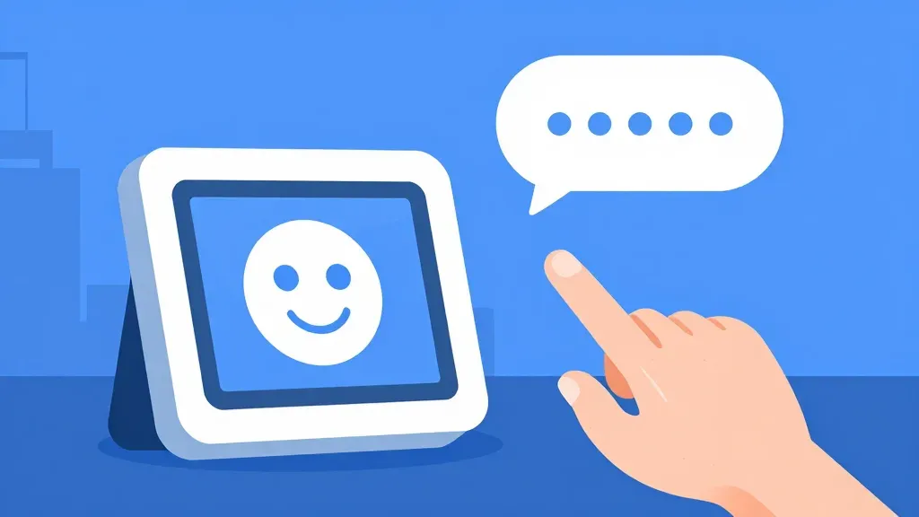A human hand interacts with a speech bubble next to a digital kiosk showing a smiley face, rendered with soft skin texture and glossy screen surface. Diffuse front lighting creates a subtle glow on the screen and speech bubble, set against a clean, abstract blue gradient background with shallow depth of field.