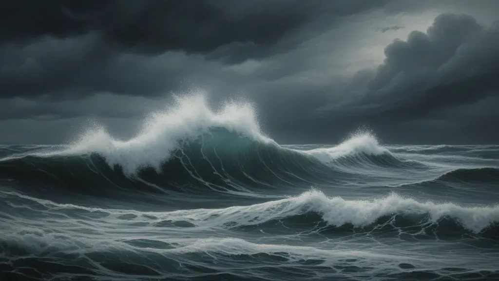 Dynamic, frothy waves crash against a stormy backdrop, illuminated by diffused, low light that enhances the dramatic texture and color palette of dark blues and whites. The composition guides the viewer through the churning water, emphasizing the intensity and mood of the scene.