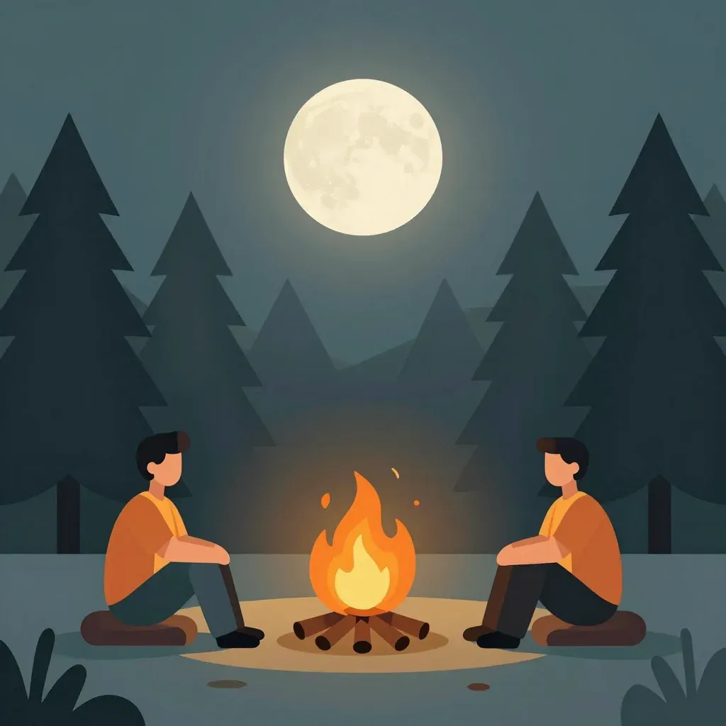 Two individuals sit warmly around a flickering campfire, bathed in the soft glow of firelight, under the cool, diffused light of a full moon. The balanced framing and depth of field highlight the serene forest backdrop.