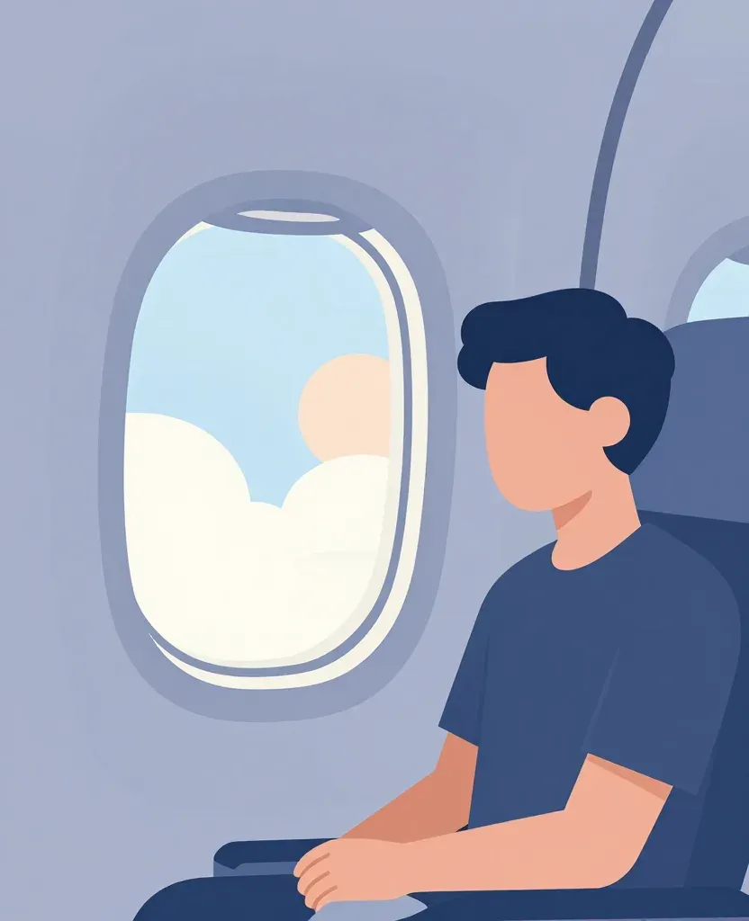 A male passenger sits by the airplane window, wearing a dark t-shirt, with soft lighting highlighting the smooth fabric and rounded skin contours. The composition features a shallow depth of field, focusing on the subject while blurring the cabin background, with the window providing a cool, even glow from outside.