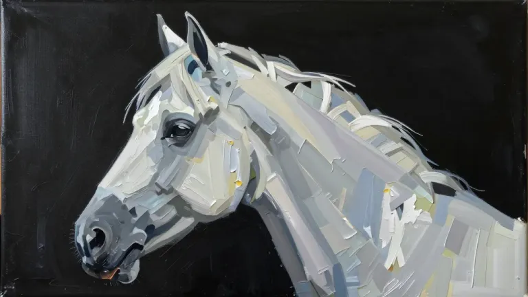 A close-up of a horse's profile, rendered in angular, layered planes that create a sense of depth and volume. The frontal light highlights the contours of the horse's features against a stark black background, emphasizing the texture and form.