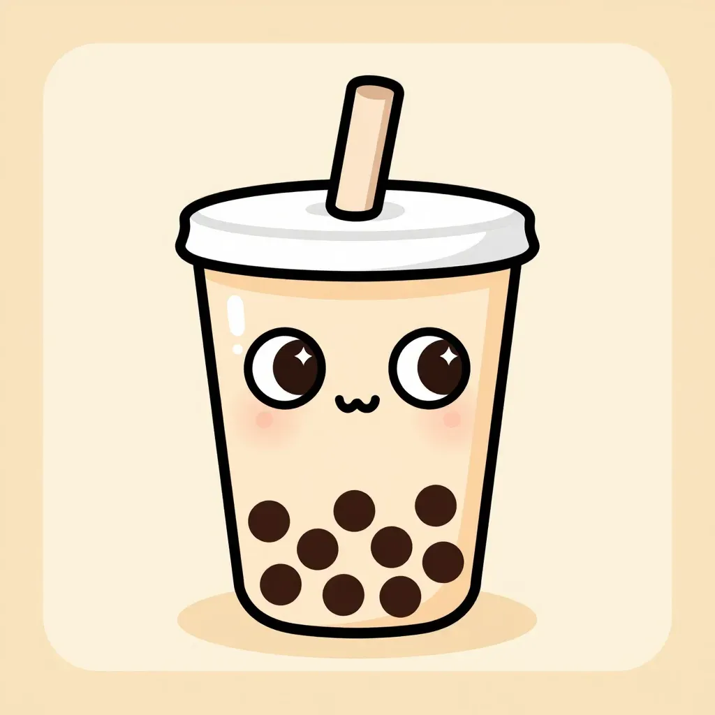 A cute, anthropomorphic bubble tea cup with large, expressive eyes and a smiling face, featuring soft tapioca pearls inside. The image is softly lit with a warm, directional light from above, creating gentle highlights and shadows, and the background is a clean, light beige, providing a clean and unobtrusive backdrop.