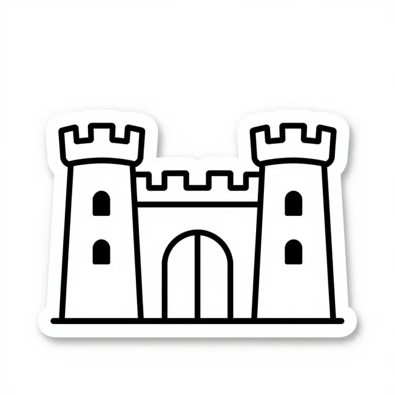 A minimalist black-and-white silhouette of a castle featuring two symmetrical towers and a central arched gate, rendered with clean, bold lines on a white background. The even, diffuse lighting and die-cut edges suggest a glossy vinyl sticker design with high contrast and a flat, centered composition ideal for graphic applications.