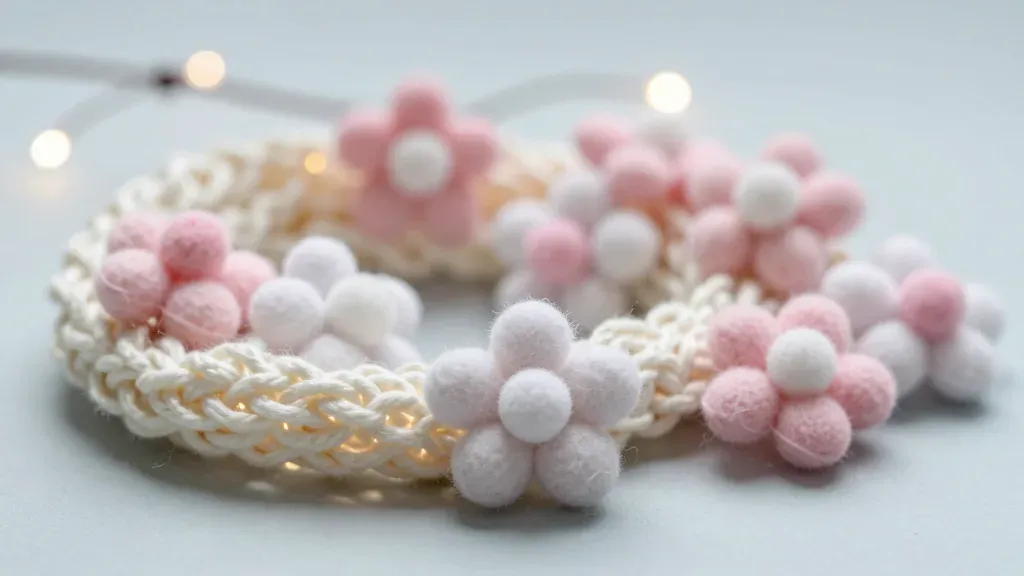 A close-up of a felt flower cluster on a woven white rope, illuminated by soft, diffused string lights, creating a warm, ambient glow. The shallow depth of field blurs the background, emphasizing the texture and details of the felt and rope.