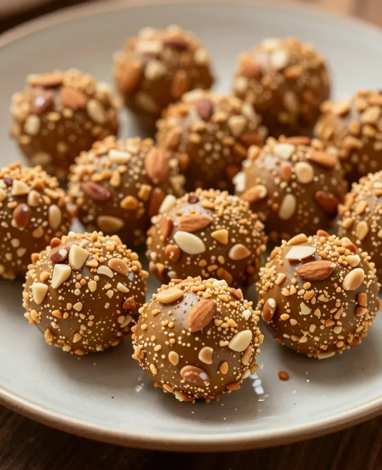 Round almond butter bites are densely coated with toasted sesame seeds and chopped almonds, showcasing a crumbly, glossy texture under warm, directional lighting. The shallow depth of field and close-up, elevated angle emphasize the natural cluster arrangement with a blurred wooden background providing earthy contrast.