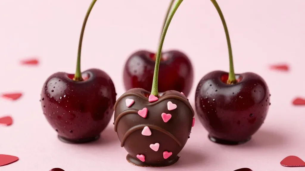 A glossy chocolate-dipped cherry adorned with pink heart sprinkles is centered among three fresh, dewy cherries, creating a romantic and indulgent still life. Soft front-top lighting enhances the reflective surfaces and shallow depth of field isolates the subject against a clean, pale pink background with scattered heart confetti.